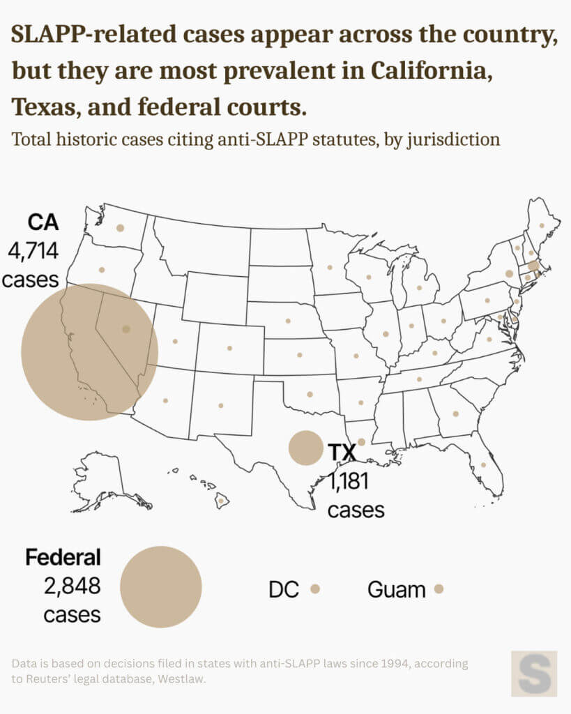 There have been thousands of such lawsuits filed since the tactic was first identified and examined in 1988, and 39 states plus the District of Columbia and Guam have enacted laws to help people facing them fight back. But those laws vary in quality from state to state, and 11 states — including Wisconsin — have no anti-SLAPP protections. Federal legislation, meanwhile, has remained elusive, hampered by a dearth of reliable data on the scope of the problem, with cases scattered across state and federal dockets. We wanted to change that.