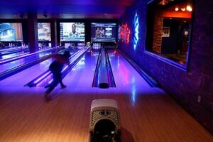 A CAR conference atendee throws a ball down the lane on Thursday night in Louisville. Photo by Travis Hartman, IRE/NICAR. Stephanie Peuriere from Strasbourg University bowls at the after hours bowling event on Thursday night in Louisville. Photo by Travis Hartman, IRE/NICAR.